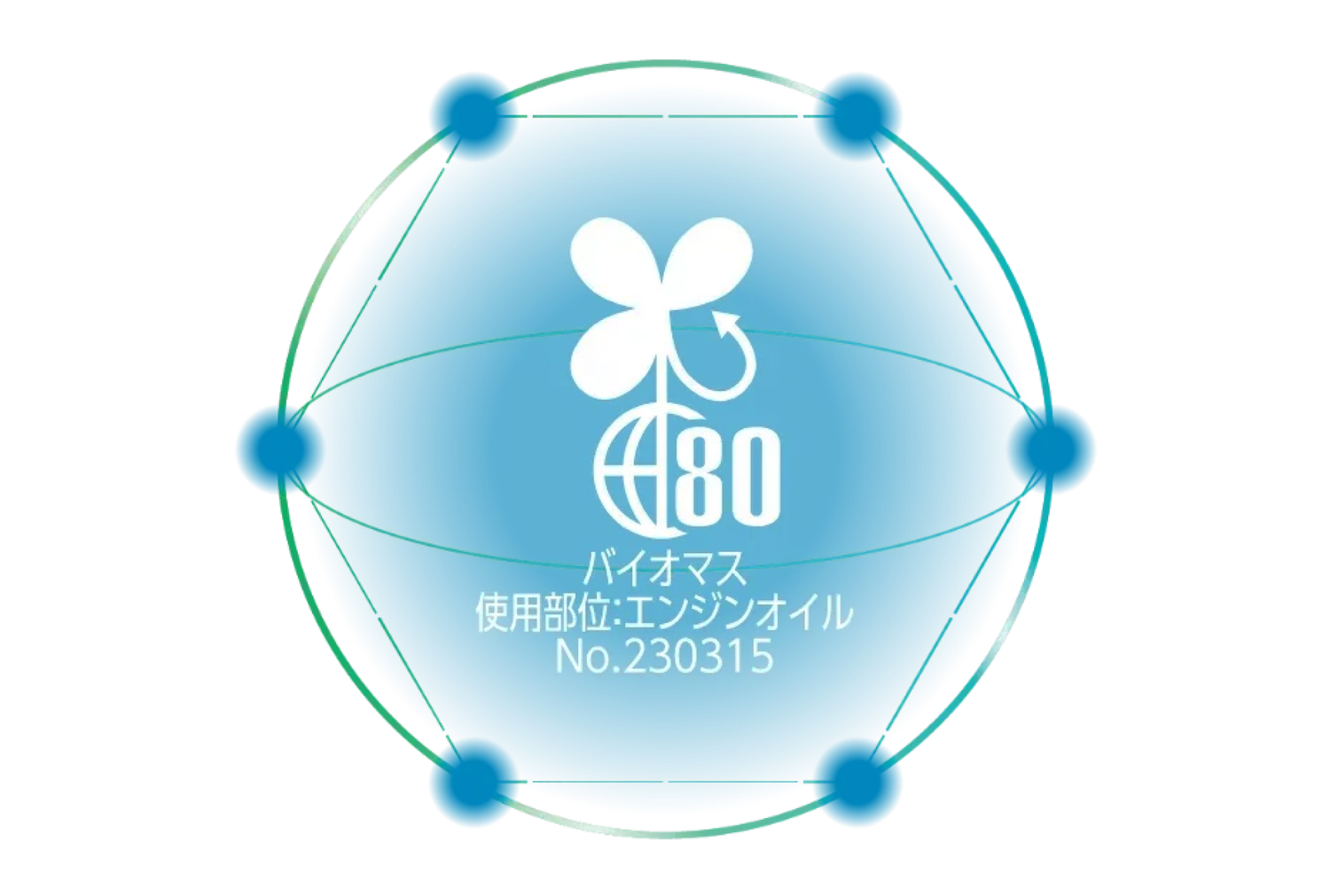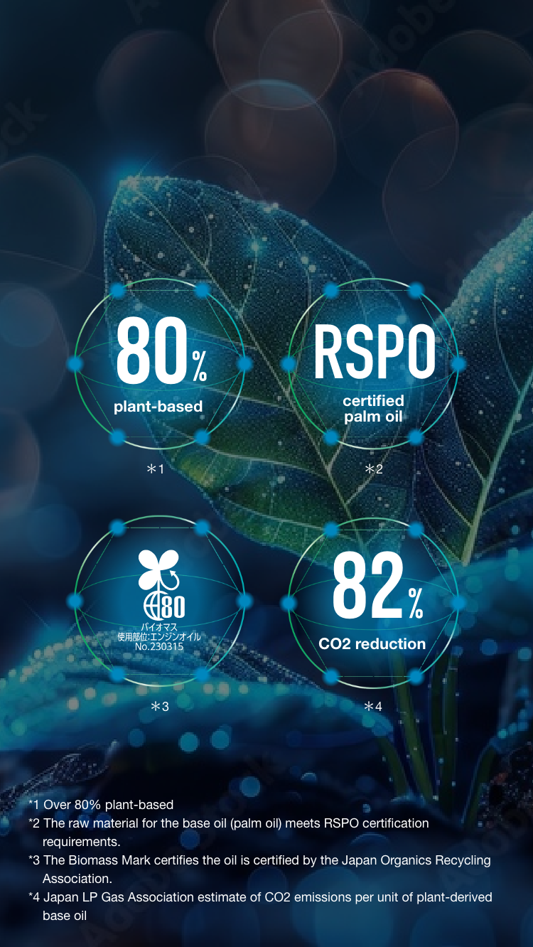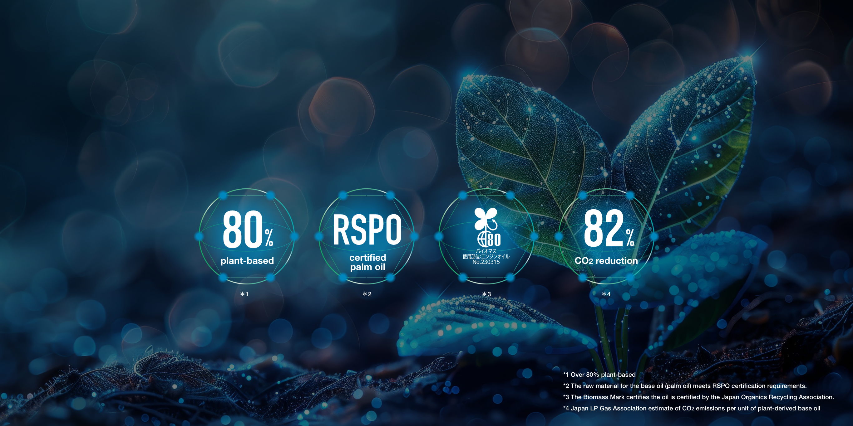 The carbon footprint is 82% lower than mineral oil, based on the Japan LP Gas Association estimate of CO₂ emissions per unit of plant-derived base oil during the entire product life cycle from raw material procurement to disposal and recycling.