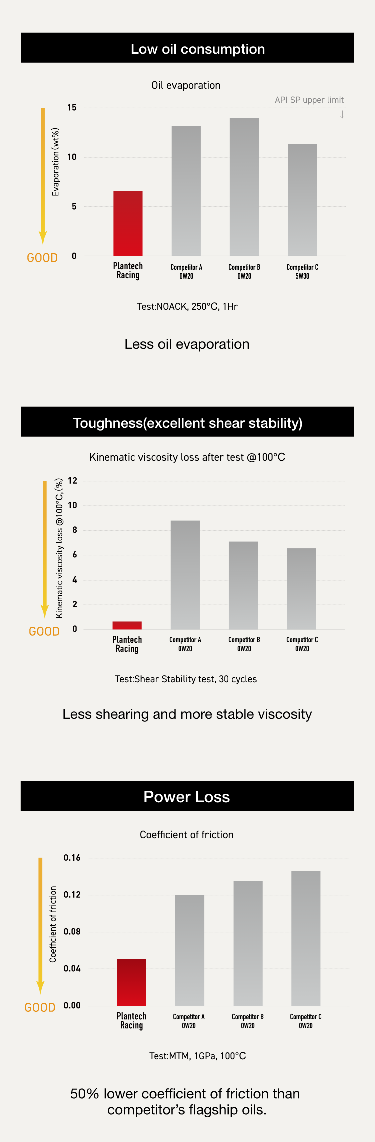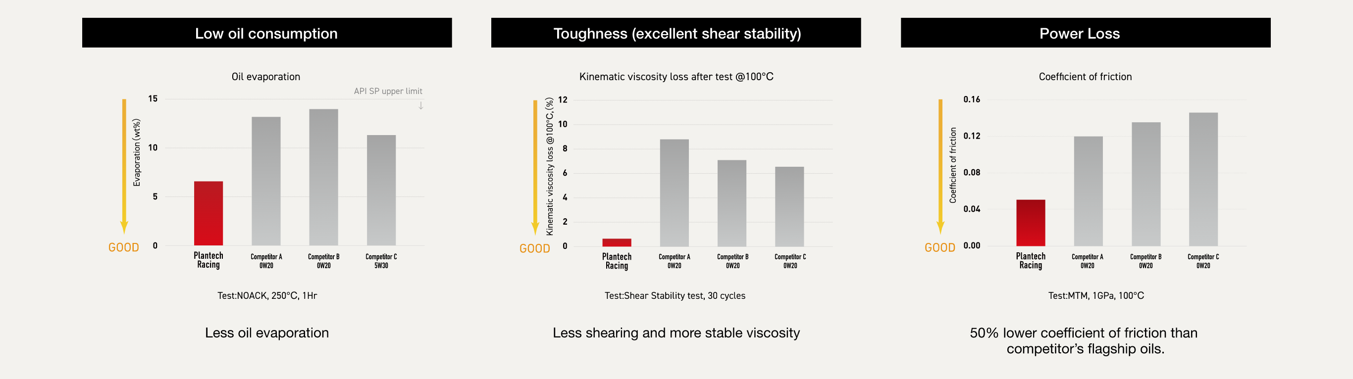 Extensive testing shows plant-based Plantech Racing outperforms IDEMITSU IFG7, our flagship engine oil, to deliver racing performance.