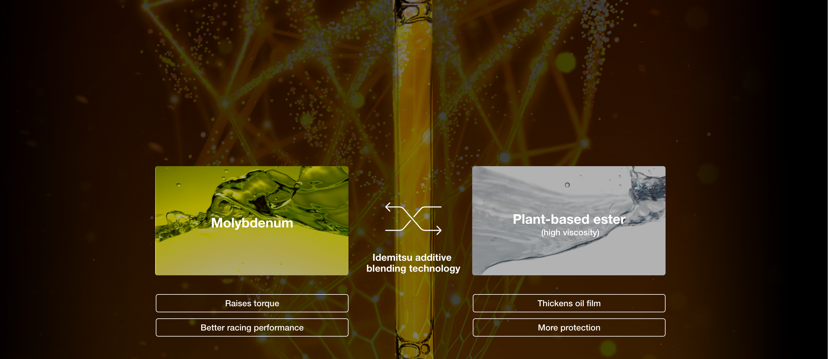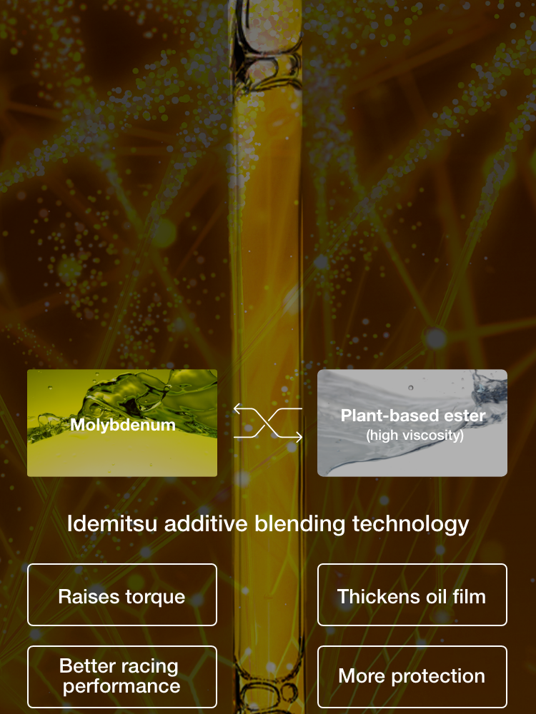 Highly refined plant-based oils do not readily dissolve molybdenum, an element that reduces power loss caused by frictional resistance. However, Idemitsu applied its know-how and nano-tailored technology to vastly increase the amount of molybdenum and improve racing performance. We further optimized durability in harsh racing conditions by formulating a high-viscosity plant-based ester – for a revolution that unites performance and sustainability.
